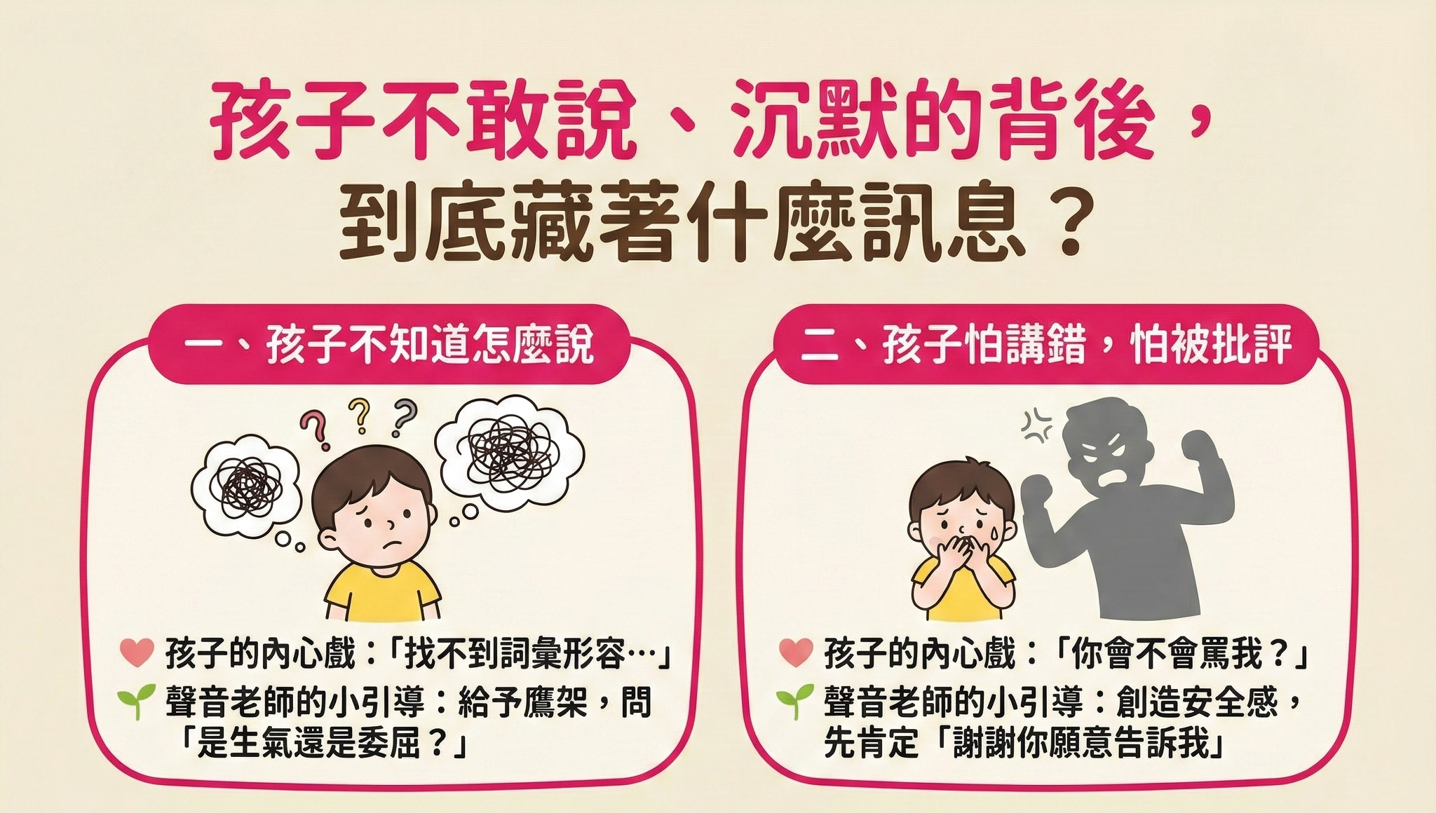 孩子不敢說話,是許多家長在教養路上最常遇到、也最困惑的情況。在我的教學現場,常常聽到家長問:「孩子明明在家很會講,為什麼在外面卻這麼安靜?」 孩子不敢 ...